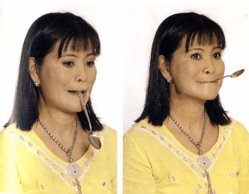 Otro ejercicio simple pero no menos efectivo para formar un bello rostro ovalado. Exhala, respira profundamente por la nariz y contén la respiración durante 5 segundos. Exhala. Tira de tus labios hacia adentro, como en el ejercicio anterior, y toma la cuchara entre ellos (pon el mango de la cuchara entre los labios). Levanta la cuchara hacia arriba, ayudándose con la mandíbula inferior. Sonríe, tirando de tus mejillas. Mantente en esta posición durante 2 segundos. Luego relaja las mejillas, sin soltar la cuchara de los labios, y comienza a repetir. Haz este ejercicio al menos 10 veces.