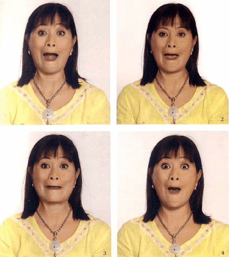 Abre bien los ojos, abre la boca y mete los labios dentro. Tensa los labios e intenta decir «a», pero no los muevas. Mantente en esta posición durante 5 segundos. No cambies la posición de los labios, trata de pronunciar «e». De nuevo, espera por 5 segundos. Haz lo mismo con los sonidos «y» y «o». En conclusión, forma un sonido «y» con tus labios, permanece en esta posición durante 5 segundos. Al formar cada uno de los sonidos, esfuerza los músculos de tus mejillas y sonríe. Repite este ejercicio 3 veces.