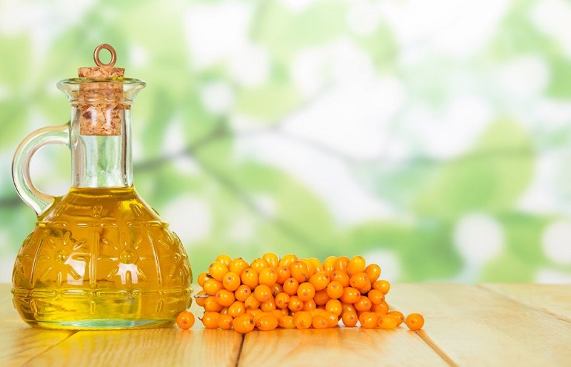 El aceite de espino amarillo contiene fosfolípidos que restauran el metabolismo de las grasas en los tejidos. Tras su aplicación, la piel no se vuelve grasa y no brilla. También es rico en esteroles, sustancias antiinflamatorias que funcionan como antiséptico.