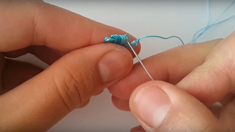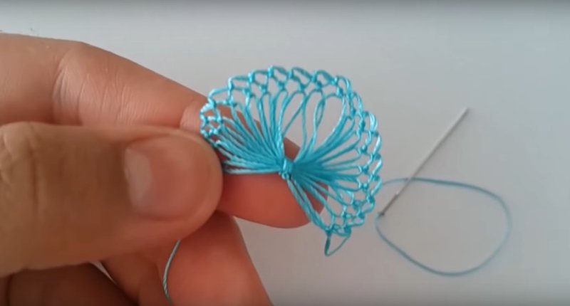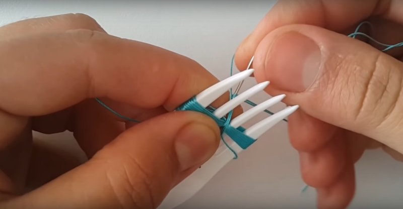 - Cuando hayas realizado varios giros, deberás atarlos en el medio. Para hacer esto, pasa el hilo por la aguja y átalo con varias vueltas. Ata el moño resultante en un nudo. Apriétalo bien.