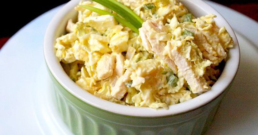Este entremés ligero y nutritivo lleva tan solo 77 calorías por cada 100 g del plato. Esto quiere decir que puedes consumir esta ensalada aunque estés a una dieta estricta. Y para preparar este plato, necesitarás solamente la carne dietética de pollo, un poco de verduras aromáticas, queso y un huevo. Puedes elegir cualquier aderezo y especias a tu gusto.