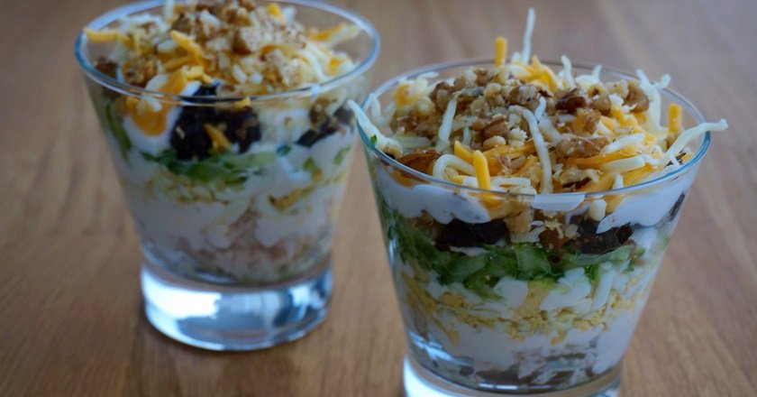 - Coloca la ensalada directamente en recipientes individuales, alternando las capas: filete de pollo, huevos, pepinos, ciruelas pasas, nueces y, finalmente, queso. Cubre cada capa con el yogur. Echa sal.