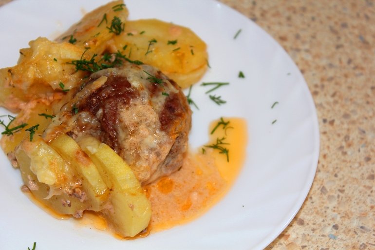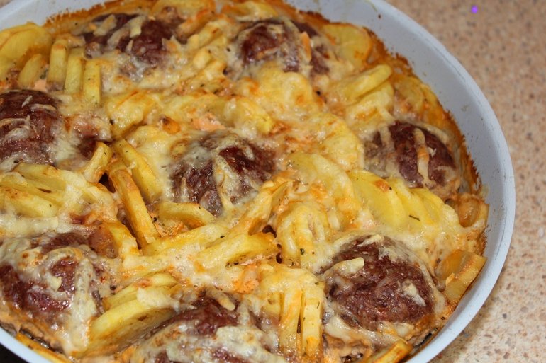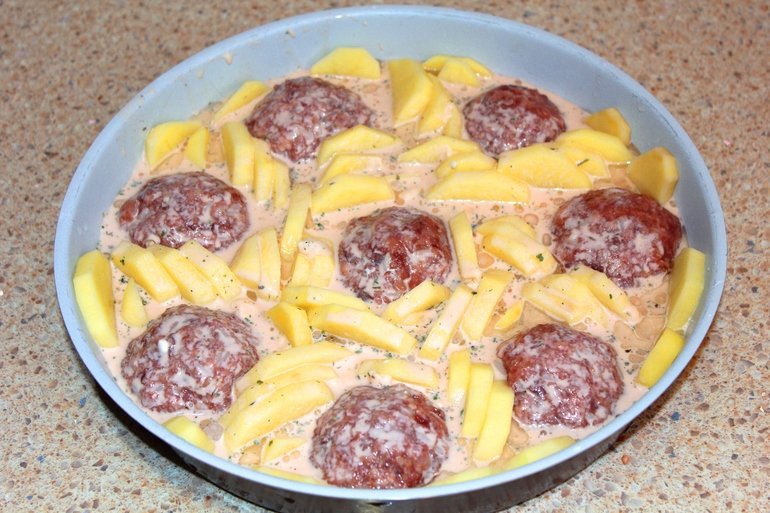 - Corta las papas por la mitad y luego en medias anillas. Lubrica el molde con aceite de girasol. Coloca las albóndigas y en los entre medios las papas.