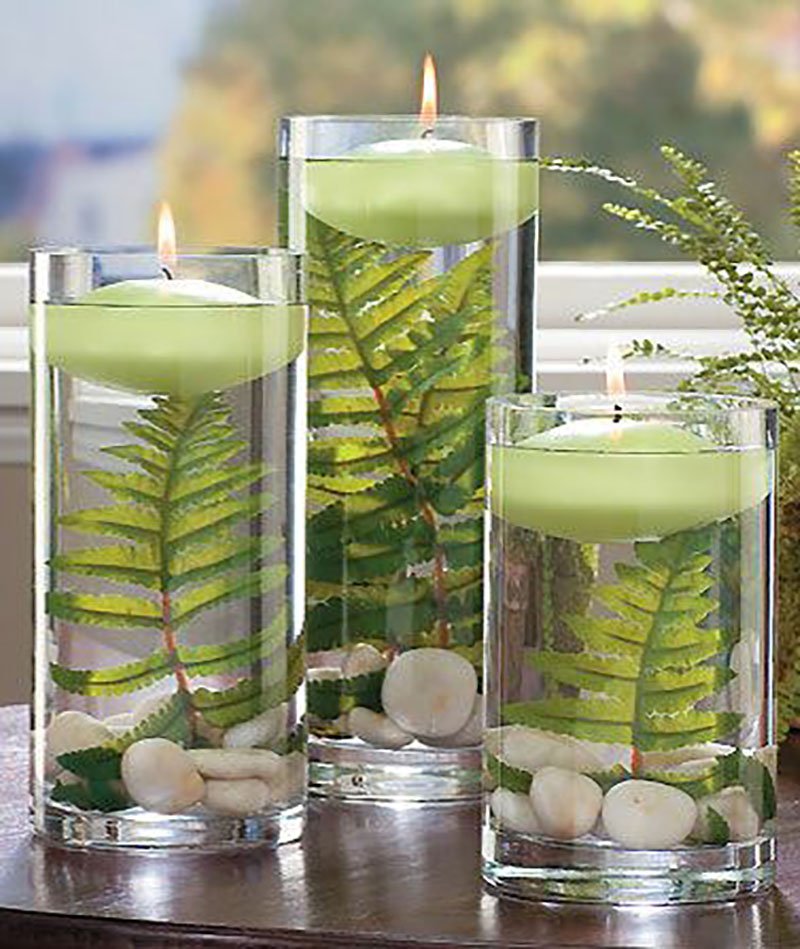 Y tal composición se puede hacer, usando un vaso convencional o una copa. Para ello, simplemente coloca dentro una hoja de helecho y rellena el vaso con agua. Si agregas una vela flotante, ¡la composición se convertirá en el centro de atración de cualquier fiesta!