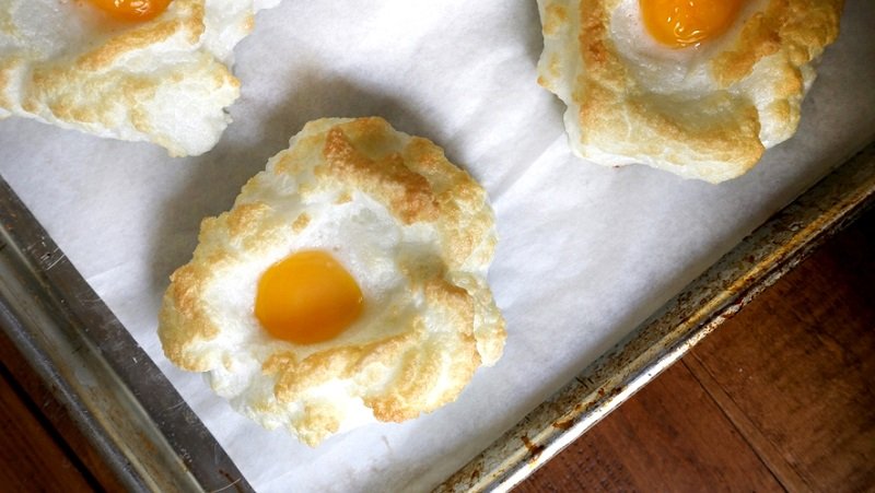 - Con una cuchara, coloca las claras batidas sobre el pergamino. Haz un pequeño agujerito en cada «colina».