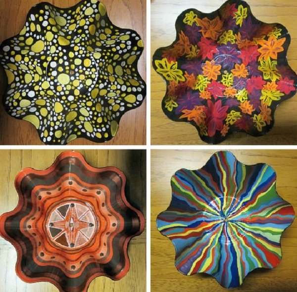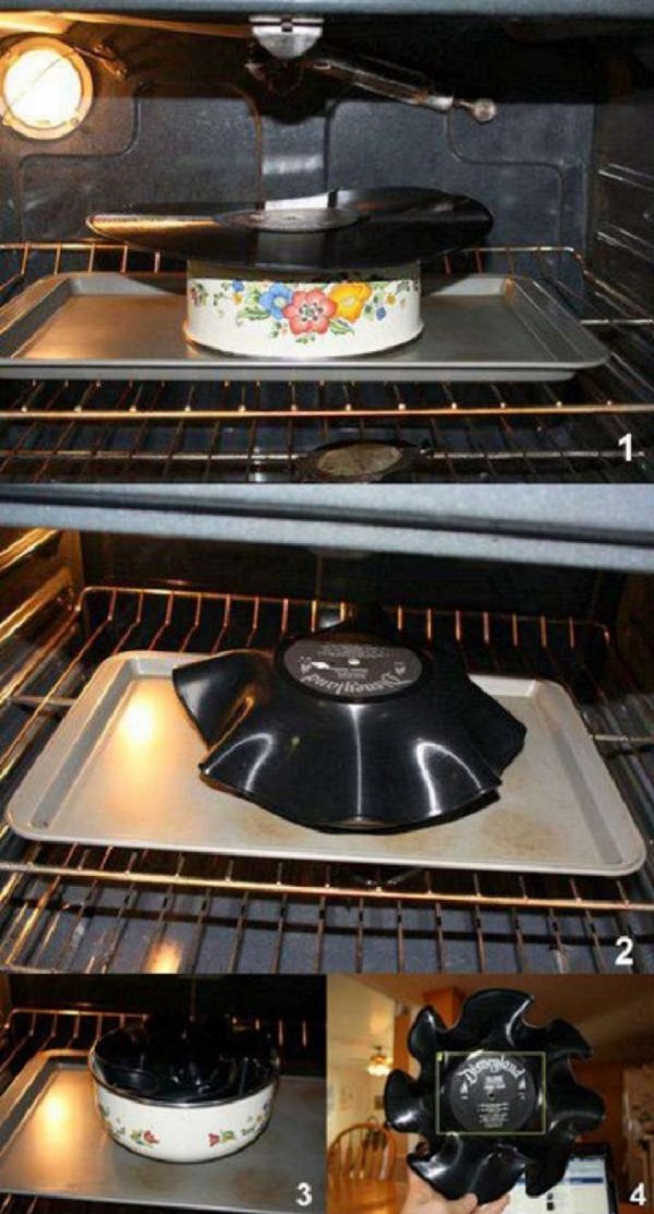 Prueba el siguiente truco. Pon un disco de vinilo sobre un plato del tamaño correspondiente, hecho de un material adecuado para el horno. Precalienta el horno hasta 200ºC, y coloca la construcción adentro. Cuando el vinilo se caliente, dale la forma de tazones de dulces.
