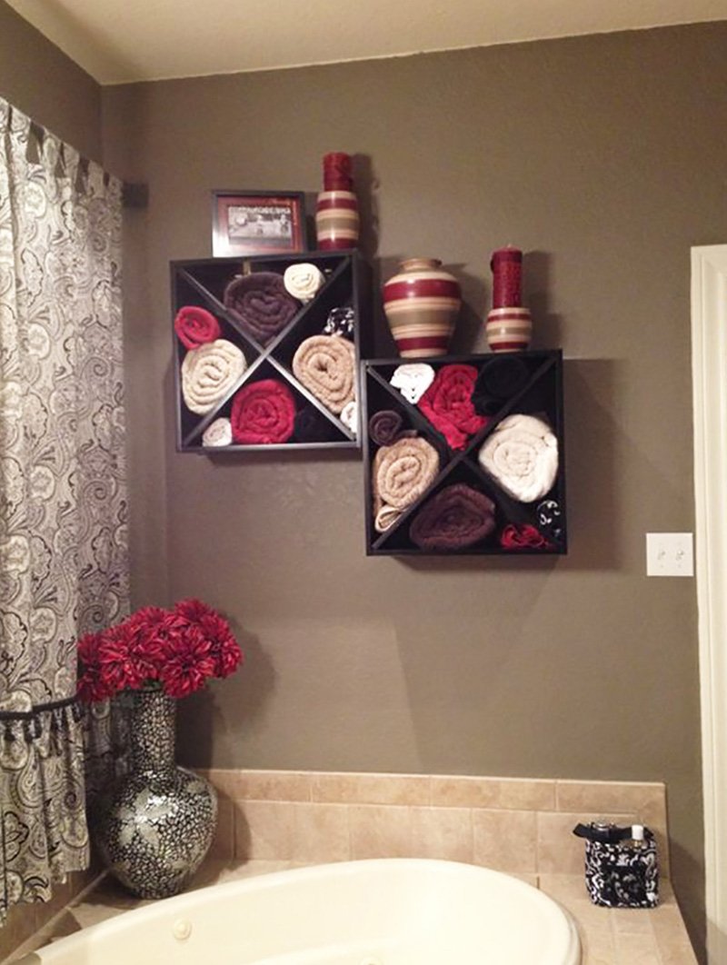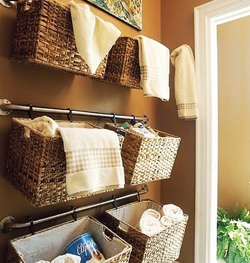- Para el almacenamiento de las toallas, también se puede utilizar cajas o cestas ordinarias, colgadas en tubos de metal.
