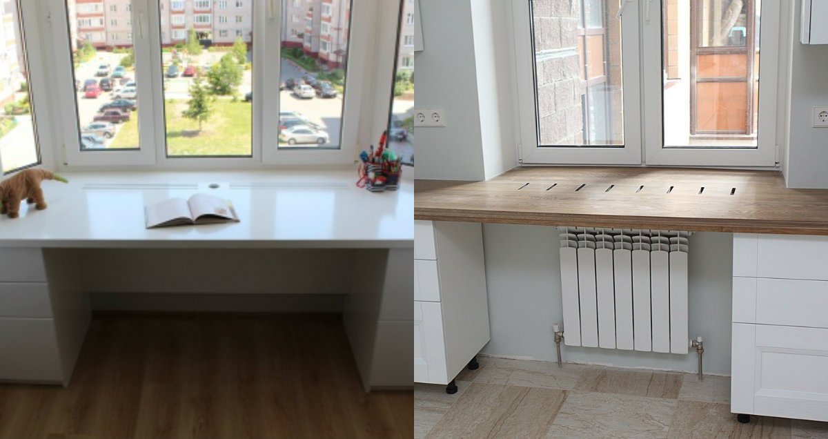 Si deseas un área de trabajo luminoso y cómodo, necesitarás un alféizar de ventana regular. Las mesas integradas en los alféizares de las ventanas se ven muy elegantes. Además, también ocupan mucho menos espacio que una encimera normal en la esquina de una habitación.