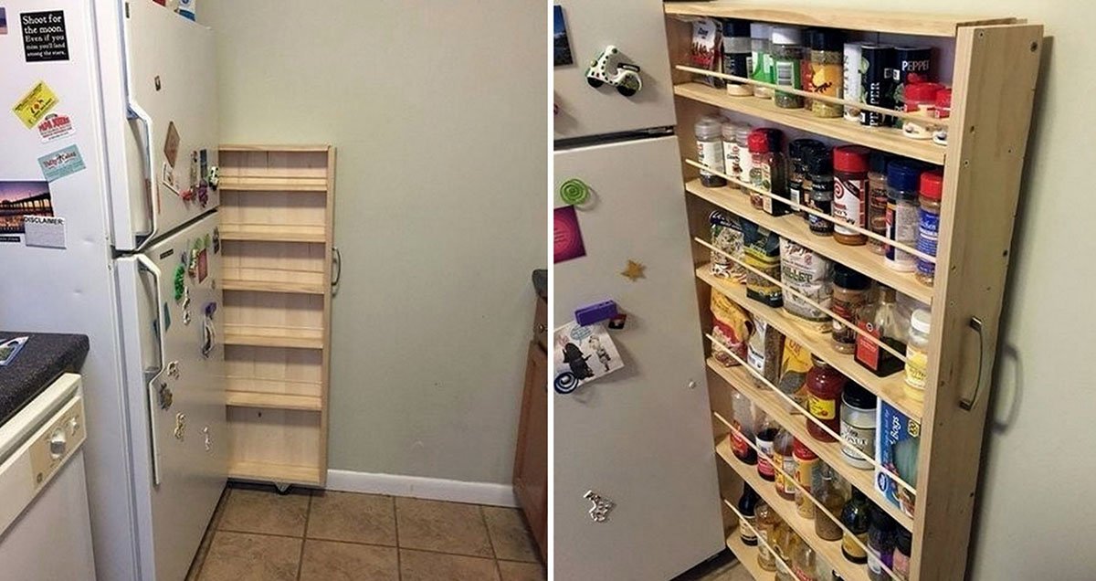 A veces disponemos de tantos frascos de especias y hierbas diferentes, que puede que no alcance suficiente espacio en el armario para todo. Entonces, ¿por qué ocupar todo un estante cuando puedes construir un cajón detrás del refrigerador? Sí, un cajón de madera extraíble para especias oculto detrás del refrigerador.