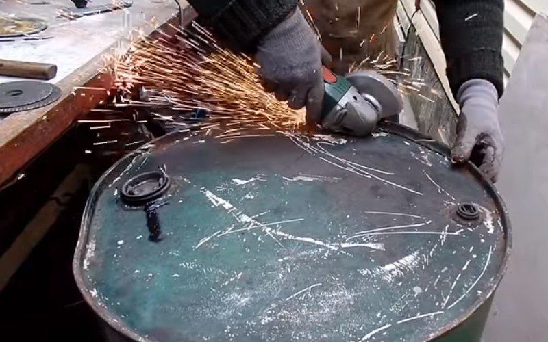 - Ponte guantes especiales para no lastimarte, o simplemente no ensuciarse las manos, pues tendrás un buen trabajo por delante. Por lo tanto, toma un barril (puede ser usado o nuevo) y un molinillo. Ahora, corta con cuidado la parte superior del tanque y resérvala para después, pues la necesitarás como una base adicional para el horno, para que el fondo real del barril no se queme tanto.
