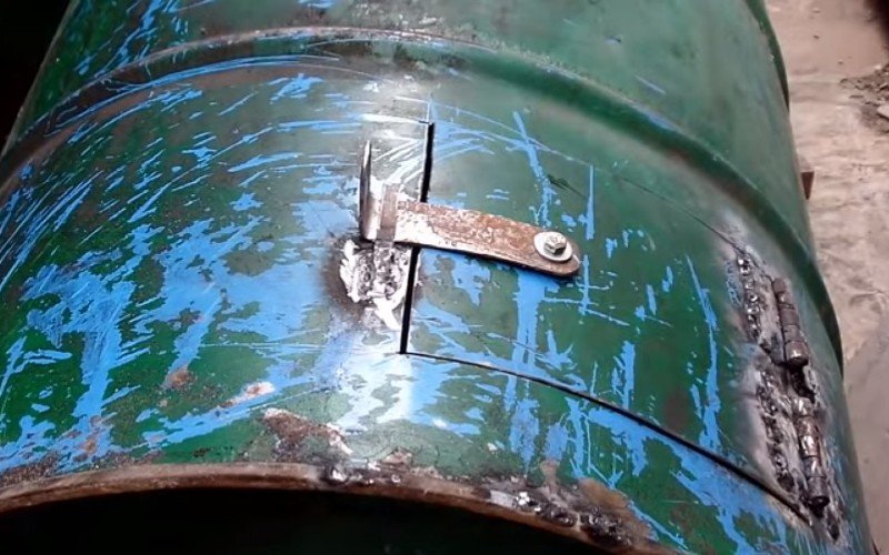 - Corta con el disco la parte derecha del cuadrado y suelda 1–2 bisagras, que sujetarán la puerta. Ahora, si tienes deseos puedes reforzar con adornos de hierro. Al final, corta los lados restantes: obtienes una bonita aleta y ponle el cierre.