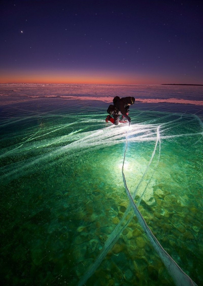 30. Hombre con una linterna en el hielo.