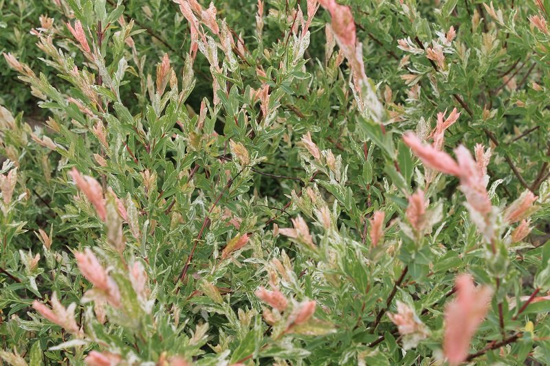 El sauce de hoja entera «Hakuro Nishiki» es un arbusto bonito y elegante. Sus hojas blancas se tornan de todos los tonos de rosa al sol.