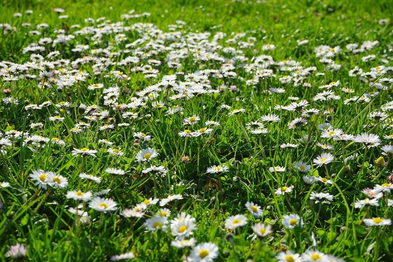 Un jardín sin flores no es jardín. Destina una gran área del terreno para el césped, donde podrás mezclar trébol, margaritas, búgula – todas esas flores no pretenciosas que formarán una espesa y bella alfombra. Además, estas flores toleran bien el corte, por lo que se puede deshacerse de las malas hierbas con una cortadora de césped.