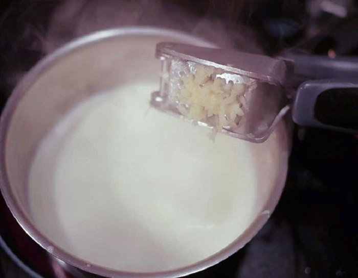 - Mezcla el agua con la leche y pon la mezcla al fuego. Cuando el líquido hierva, agrega el ajo y baja el fuego hasta el mínimo.