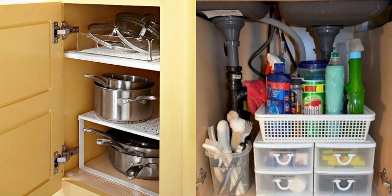 Utiliza todo el espacio disponible en la cocina. Por ejemplo, un nicho debajo de un fregadero puede servir como escondite para un bote de basura. Si lo organizas correctamente, ahorrarás mucho espacio. Utiliza toda la altura de los gabinetes de su cocina. Hay muchos organizadores colgantes para colocar en los estantes. Utiliza inserciones para cajones.