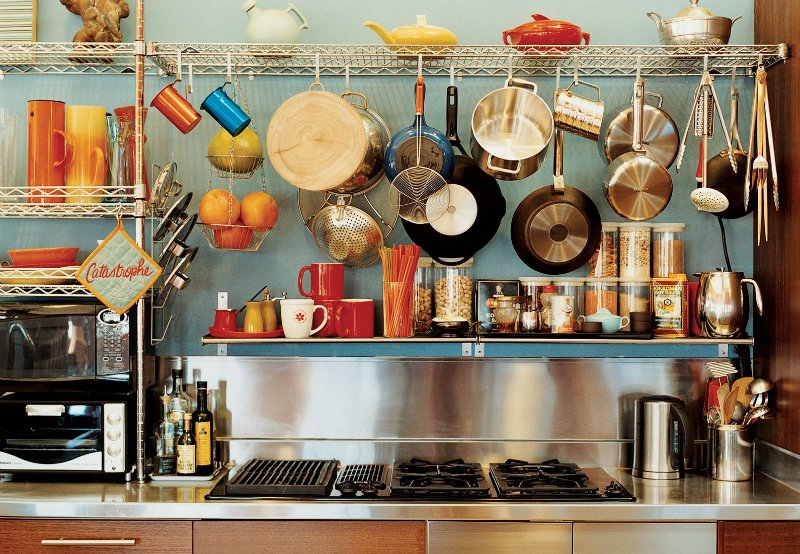 Queremos recoger los elementos necesarios, pero obtenemos una acumulación de polvo, grasa, suciedad. Como resultado, no solo se debe lavar la encimera, sino también todos estos frascos y posavasos expuestos. Esconde todo lo que puedas en los casilleros, ¡ahorra tiempo!
