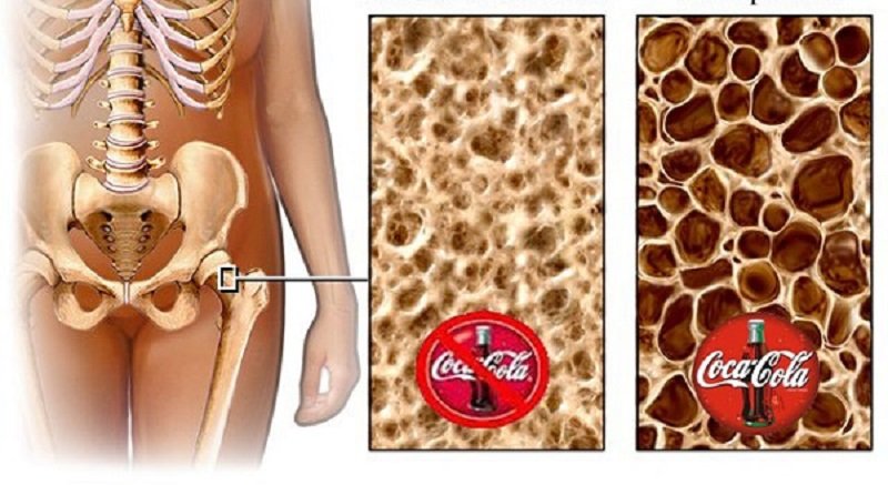 En la Coca-Cola hay ácido fosfórico, que suele enlazar elementos importantes como calcio, magnesio y zinc en el intestino. En poco más de una hora, estos micro elementos se excretan del cuerpo, lo que a largo plazo conlleva a un déficit de ellos… Como resultado, nuestros huesos se vuelven más frágiles y el metabolismo se hace más lento. Esto es especialmente peligroso para los niños y ancianos, que, de por sí, ya tienen huesos frágiles.