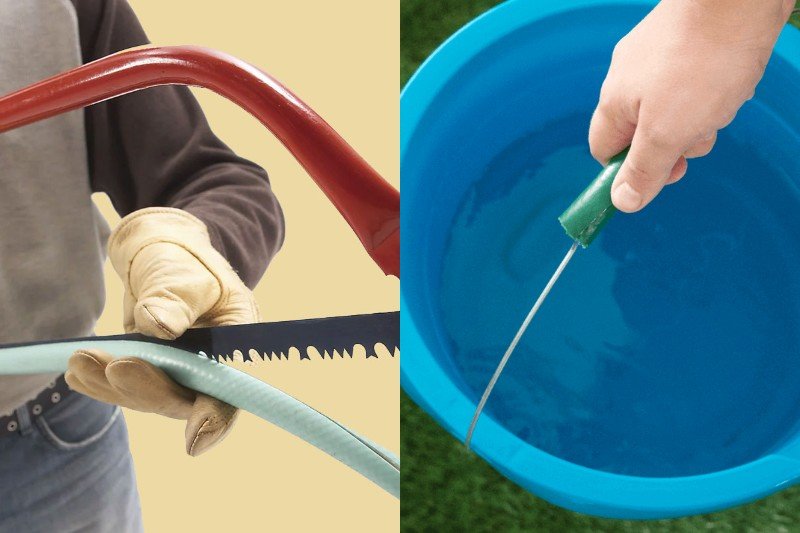 Corta la longitud requerida de la manguera y haz un corte longitudinal en esta pieza. Ponle el mango y fíjalo con cinta adhesiva. Ahora será mucho más conveniente transportar el agua. La misma pieza de manguera servirá como protección extraíble para el hacha o las hojas de sierra.