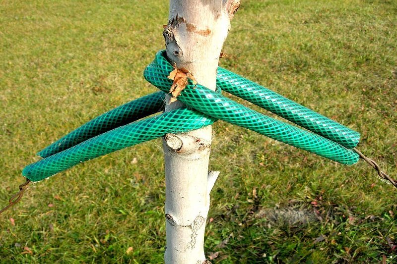 En lugar de usar hilo, alambre o plástico para mantener las plántulas en posición vertical, usa trozos de manguera. Solo tienes que colocarlos alrededor de las áreas que están en contacto con la corteza, para no dañar el árbol joven.