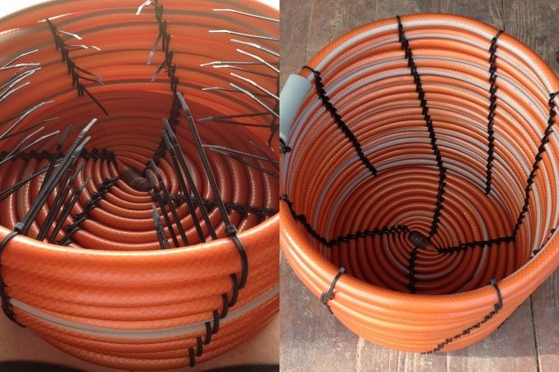 Las mangueras finas y muy suaves son las más adecuadas para este propósito. Es más fácil trabajar con ellas, el diseño se verá ordenado y su peso no será demasiado grande. En el curso del tejido, las paredes de la canasta serán sujetadas con alambres o bridas.