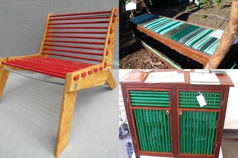 Las mangueras flexibles pueden decorar los muebles del jardín. Parece simple, pero al mismo tiempo no hay temor a la humedad, y no requieren cuidados especiales.