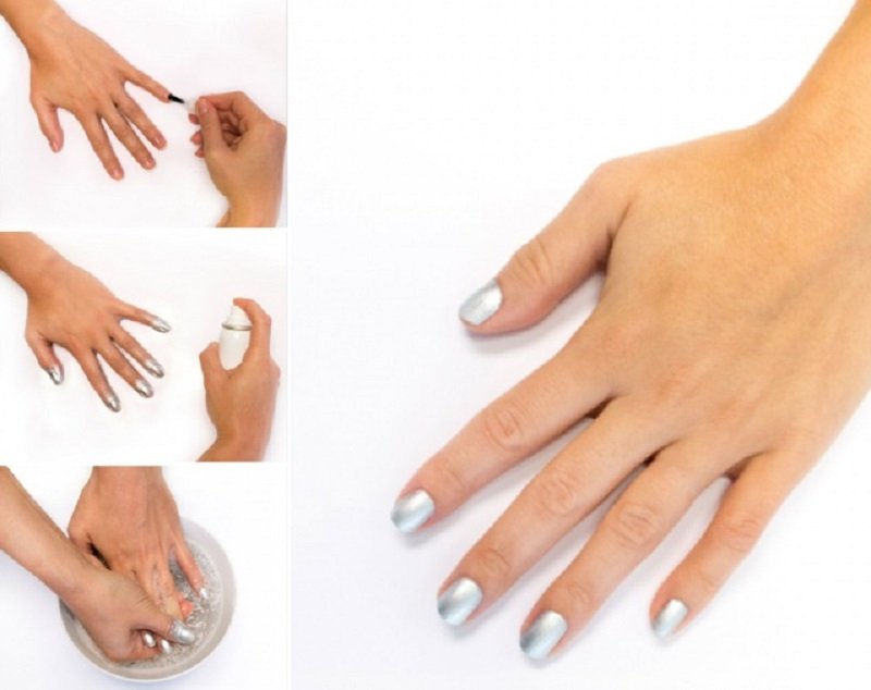 Simplemente aplica a las uñas la base transparente, le sigue el spray. Después, vuelve a aplicar la base para fijar el barniz. Luego, lávate las manos con agua y jabón.