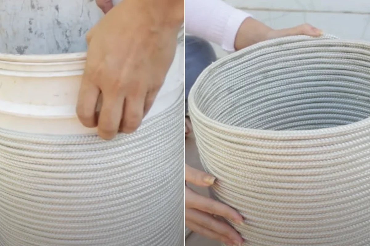 - Lleva la espiral hacia arriba, pero en ningún caso pegues la cuerda al cubo, no lo necesitarás. Cuando las paredes estén completamente formadas, saca el cubo. Básicamente, ya tienes una canasta lista. Sin embargo, hay que terminar el trabajo por completo.