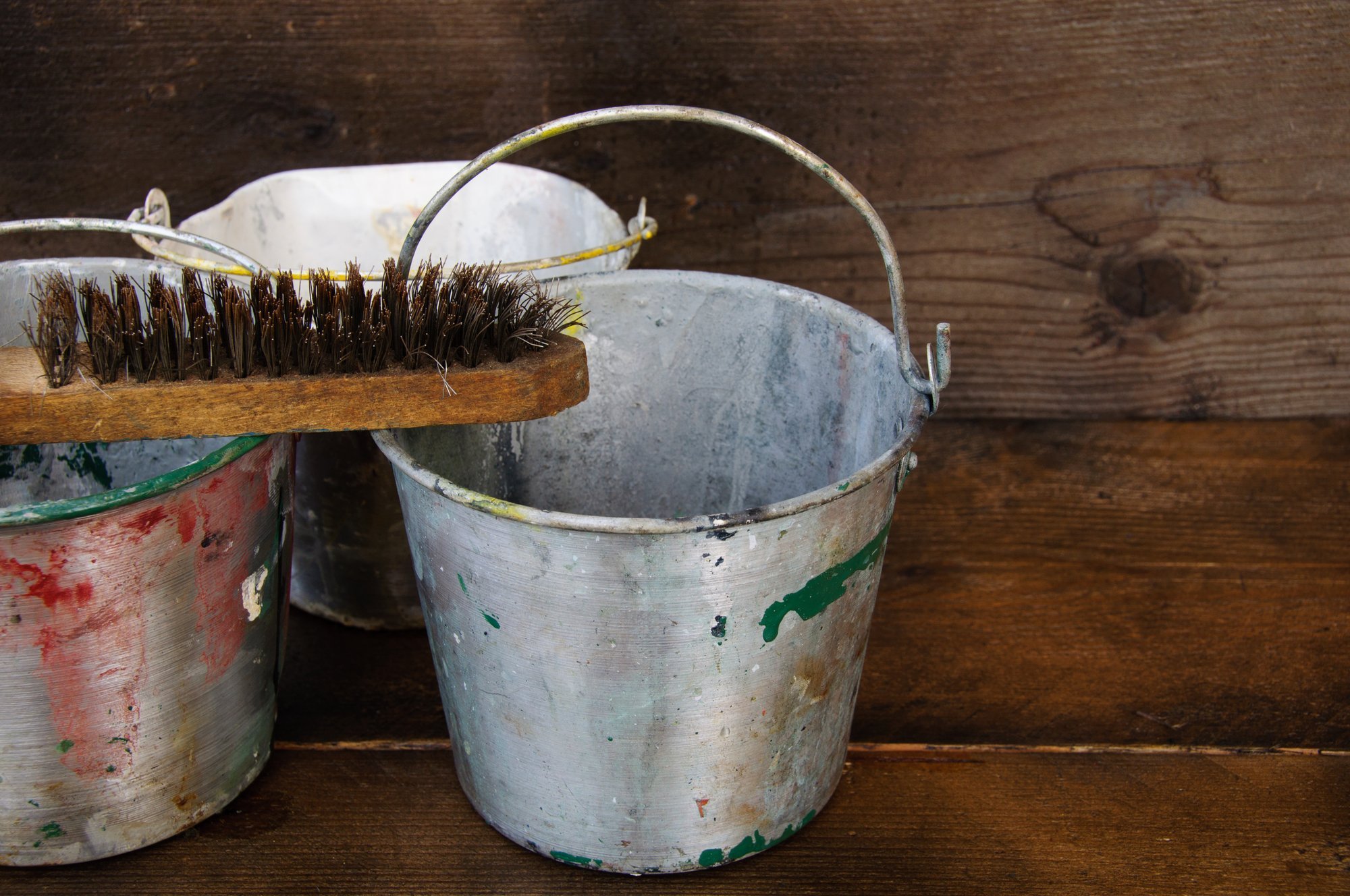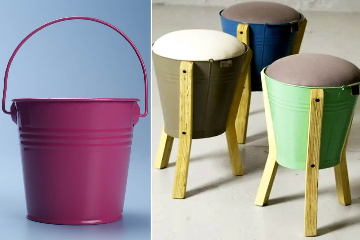- Primero, pinta el balde con tu color favorito y déjalo secar. Una vez que esté seco, atorníllele las vigas de madera curvadas. Esto debe hacerse con cuidado: las piernas deben estar estables.
