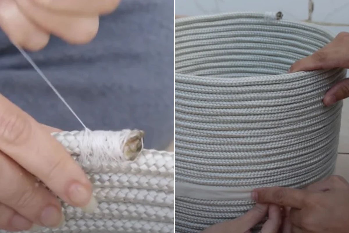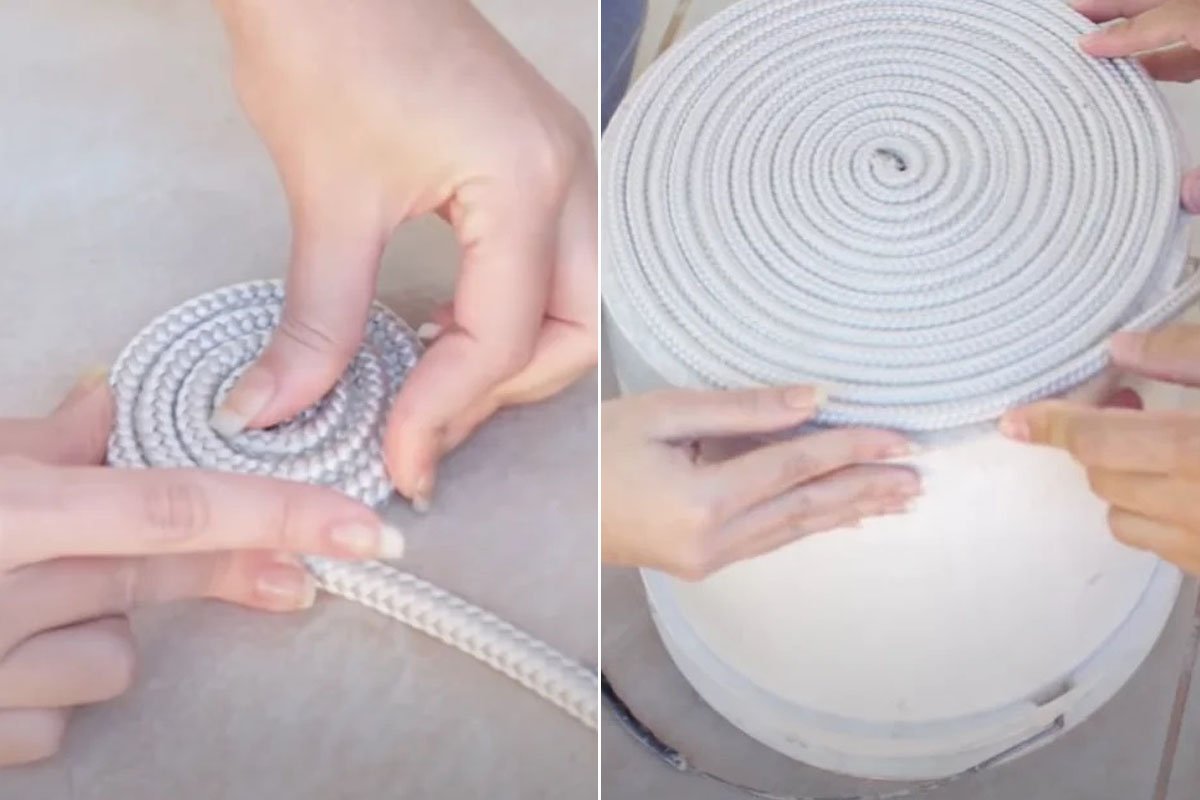 - Lleva la espiral hacia arriba, pero en ningún caso pegues la cuerda al cubo, no lo necesitarás. Cuando las paredes estén completamente formadas, saca el cubo. Básicamente, ya tienes una canasta lista. Sin embargo, hay que terminar el trabajo por completo.