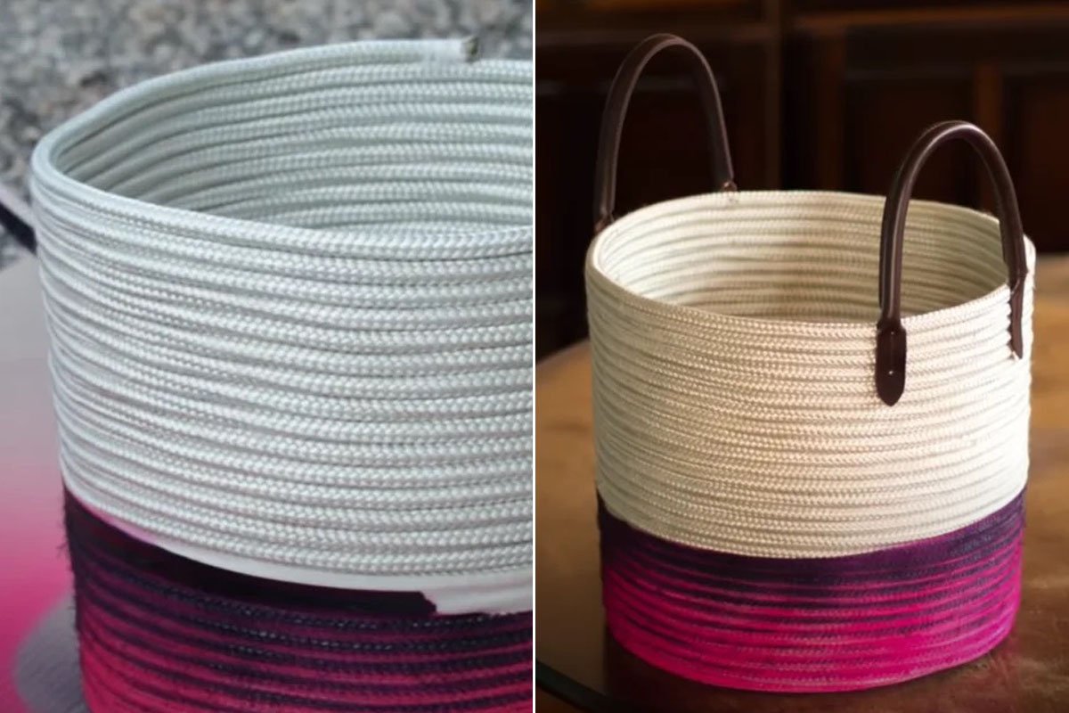 - Usando el mismo pegamento e hilo, fija los mangos a la canasta. Y ahora, si lo deseas, con la ayuda de una cinta adhesiva, marca la parte de la canasta sobre la que pintarás. Pinta sobre ella con pintura en aerosol, deja que se seque y úsala según lo previsto, sabiendo que la hiciste con tus propias manos de principio a fin.