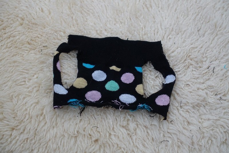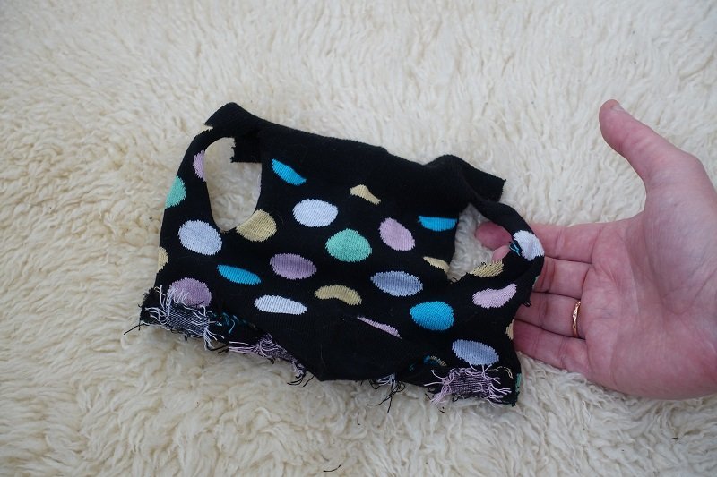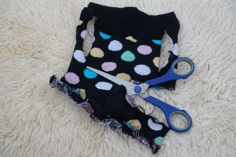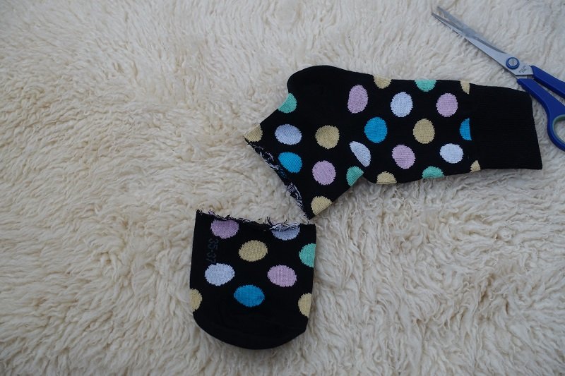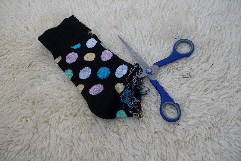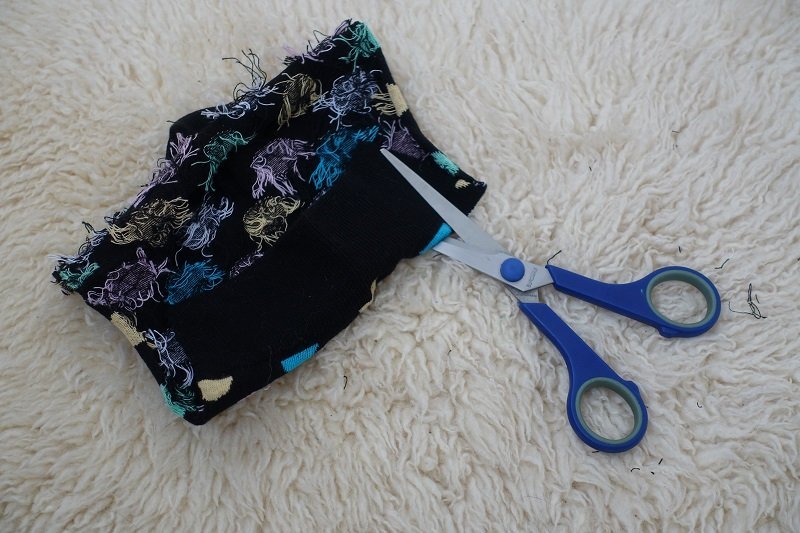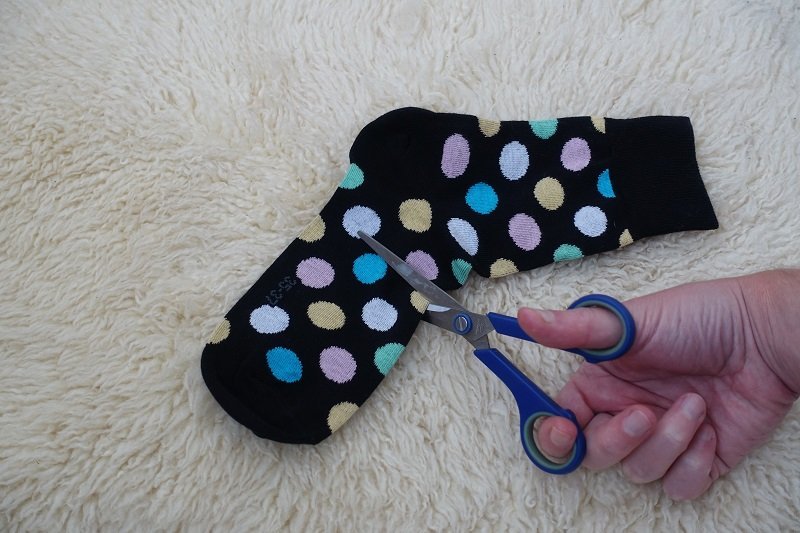 - Primero, corta el calcetín por la punta, (ya no necesitaremos esta parte). Cuando hice esto, resultó que había muchas pelusas adentro. No puedo decir que eso me detuvo, pero para algunos las pelusas pueden resultar incómodas o desagradables. Necesitas comprobar.
