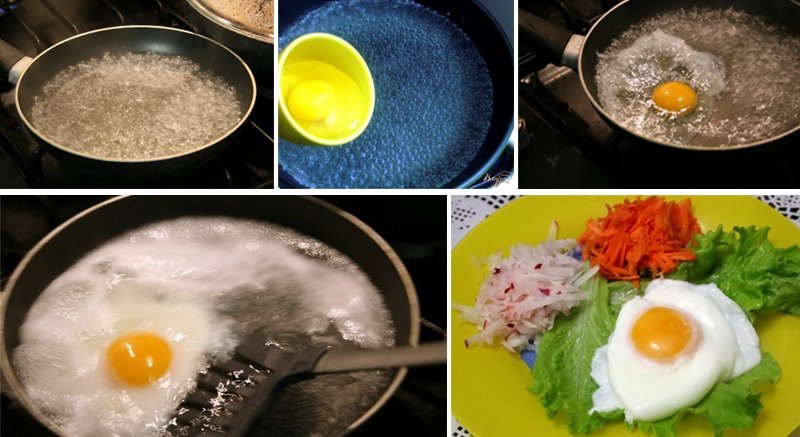 - Los huevos revueltos resultarán tiernos si los fríes en agua. Vierte la mitad del agua en la sartén, y espera hasta que hierva. Con cuidado para que las yemas no goteen, rompe los huevos en agua hirviendo y cubre. ¡Después de 2 minutos, el plato estará listo!