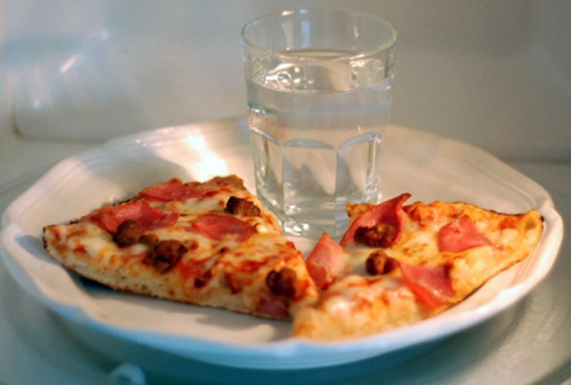 - Calienta la pizza o pastel enfriado en el microondas con un vaso de agua. El líquido se evaporará y el plato no se secará demasiado.
