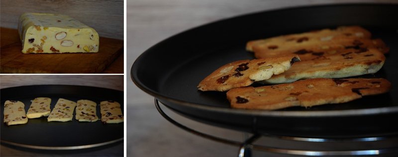 Corta las galletas de 5 mm de grosor, cuando la masa esté ligeramente descongelada. Hornea en una sartén seca a fuego lento, friendo por ambos lados, o por 10 minutos en el horno a 180 grados.