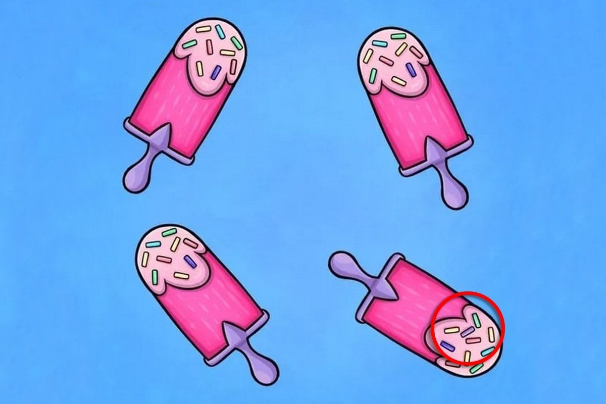 - Y llegamos a la tercera tarea. Aquí lo más importante era recordar exactamente el aspecto de las virutas de colores sobre el helado. Al fin y al cabo, son sus colores los que distinguen el postre frío de la esquina inferior derecha de la ilustración de los demás. ¿Has conseguido encontrar el elemento extra sin ninguna pista?