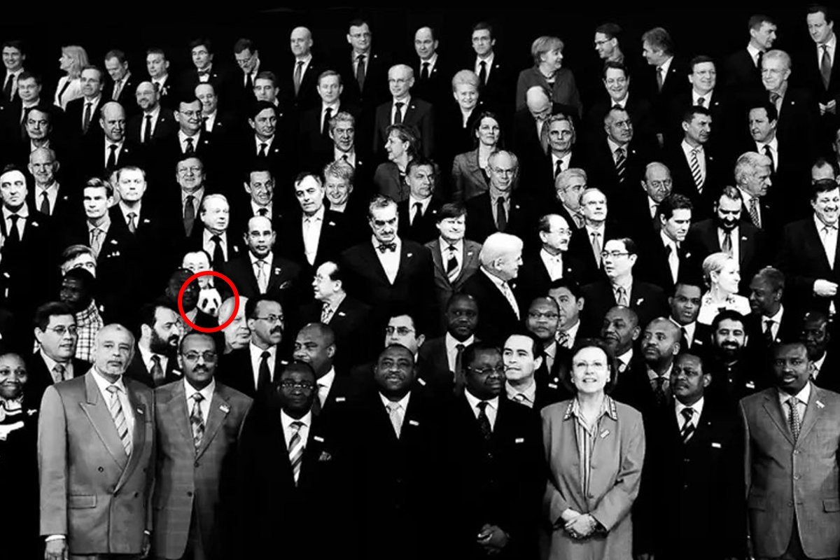 - Y, por supuesto, la respuesta al último problema. Un gran número de caras y colores en blanco y negro intentan confundir al lector. Pero si nos concentramos, podemos ver que todo este tiempo el astuto panda ha estado escondido justo a la izquierda del centro de nuestra imagen.