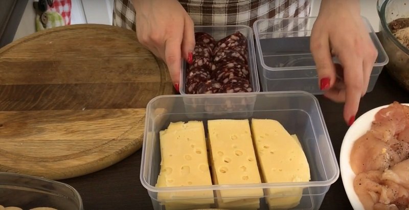 Para su preparación, necesitarás dos recipientes de plástico pequeño: en uno se pone el queso cortado y en el otro – la salchicha. Por la mañana, cada miembro de la familia puede hacer su propio sándwich favorito.