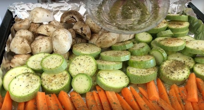Como guarnición, se recomienda consumir verduras asadas y champiñones. Para ello vamos a cortar las setas, calabacines, zanahorias, añadir las especias y los condimentos favoritos, y luego hornearlos durante 20 minutos a 180 grados. ¡En la temporada de verduras, no te olvides de preparar ensaladas frescas!