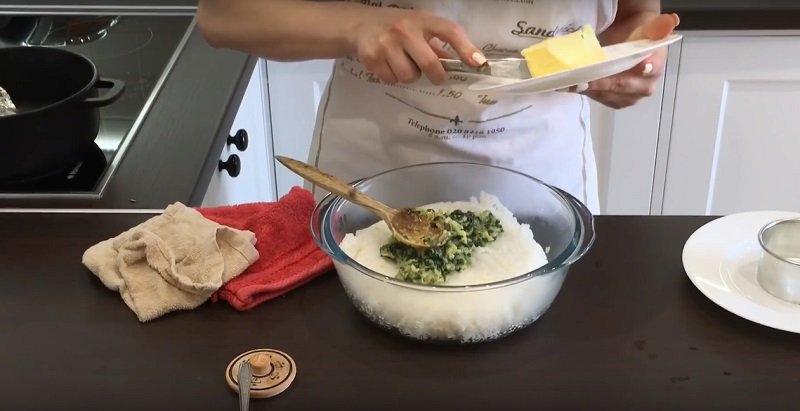 Como guarnición, te proponemos cocinar arroz con espinacas. Para ello, hierves el arroz a la manera familiar y fríes la cebolla con las espinacas en mantequilla. Cuando el arroz está listo, se debe unir a lo frito y adicionarle 100 gramos de mantequilla.