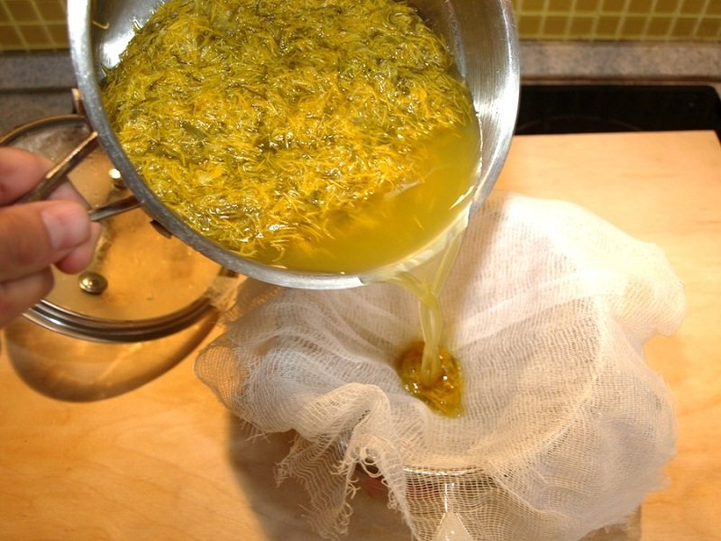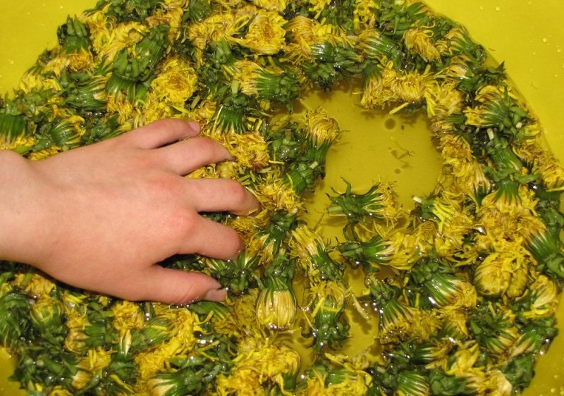 - Al día siguiente, enjuaga las flores nuevamente, exprime, échalas en una cacerola y viértele 500 ml de agua hervida.Cuando el agua hierva, hierve los dientes de león durante otros 15 a 20 minutos.