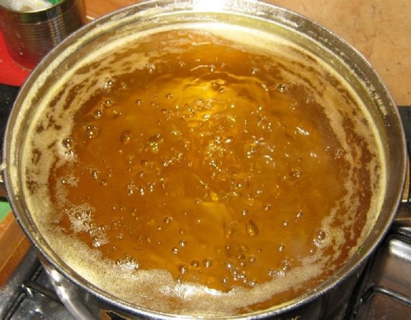 - Cuando la mezcla adquiera un color dorado miel, retírala del fuego. Cuando se haya enfriado, pásala a través de una gasa y luego cocina a fuego lento durante otros 2 minutos.
