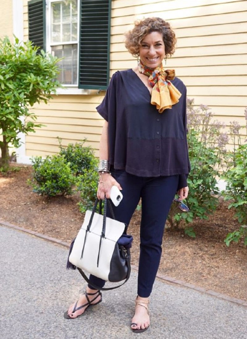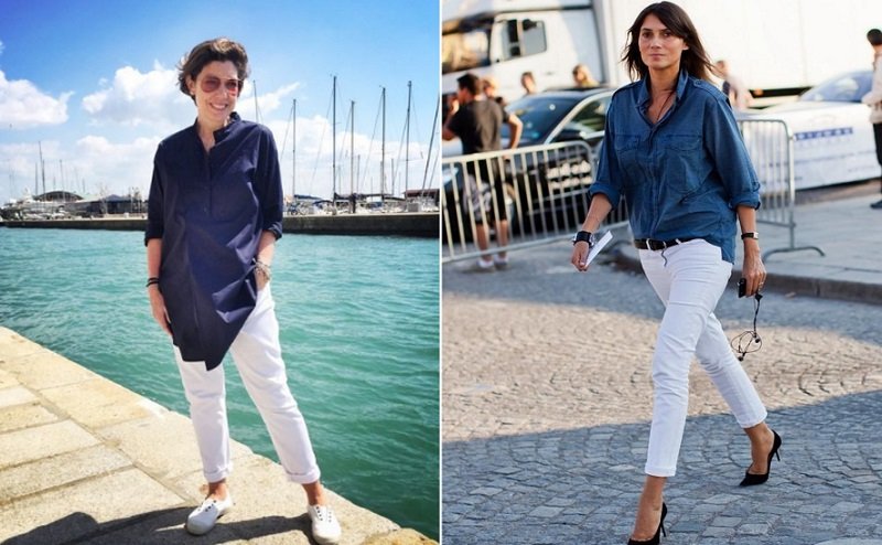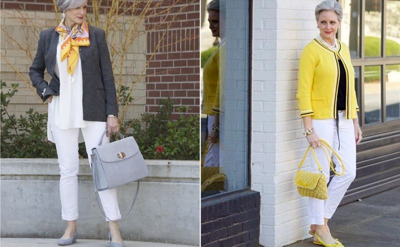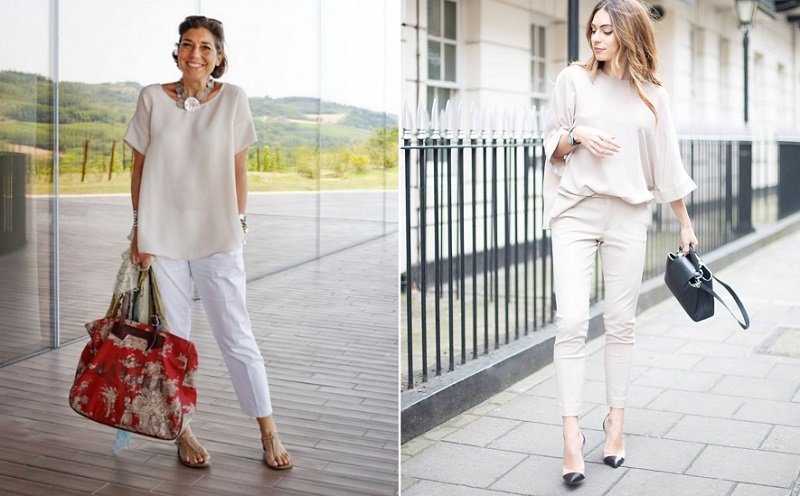 - La sencillez y la concisión son las mejores amigas de las mujeres mayores de 50 años. Un pantalón chino blanco, una camisa larga y unas zapatillas de colores claros te ayudarán a sentirte cómoda, libre y fresca. Y si te pones zapatos de tacón delicados, obtendrás un aspecto completamente diferente: romántico y un poco formal. En este equipo, puedes ir a la tienda o dar un paseo romántico por la costa del mar.