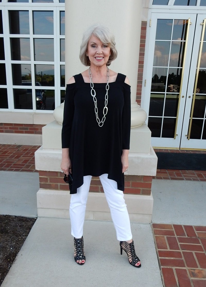 - Un atuendo atrevido para señoritas y mayores de 50 años. Pantalones chinos blancos, una blusa con hombros descubiertos, sandalias elegantes y una cadena pegadiza: ¡las miradas de admiración de los demás estarán garantizadas!