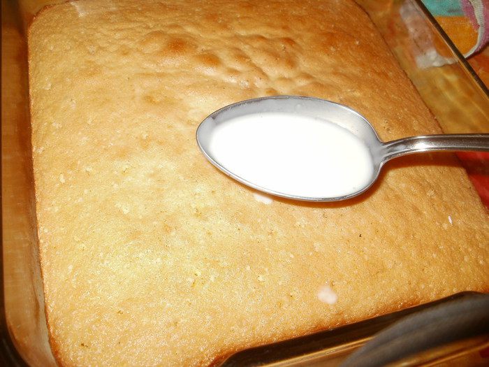 - Mientras la masa se hornea, prepara el sirope. Calienta un vaso de leche con 110 g de azúcar y vainilla. Retíralo del fuego, agrégale 2 vasos de leche fría, y mézclalo. Luego, viértelo sobre la masa ya horneada, de manera que la cubra uniformemente.