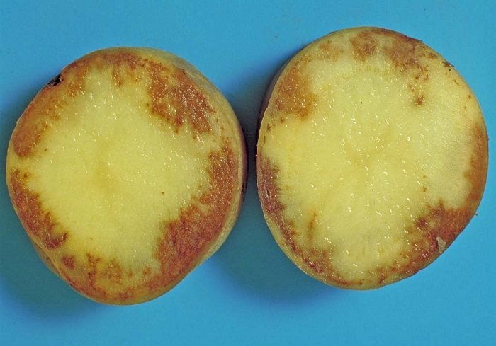 - Manchas oscuras en la cáscara, o incluso pequeños puntos, son un síntoma directo de moho, una enfermedad que afecta a los tubérculos desde dentro. Estas patatas no vale la pena comprar, incluso si en el lote hay una sola con tal defecto. El resto puede tener la enfermedad oculta.