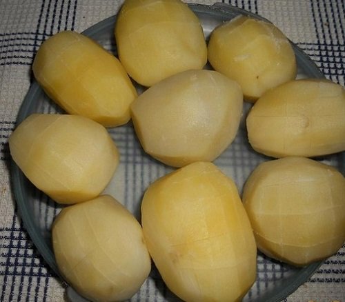 - Toma unas patatas del tamaño medio, lávalas y pélalas. Cocínalas en el agua hirviente con una pizca de sal durante 5-7 minutos.