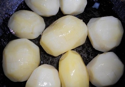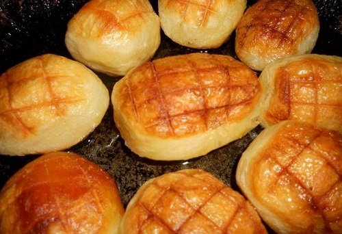 Este plato, que sabe un poco dulce, me acuerda del puré de papas con cáscara crujiente. Además, de esta manera, las patatas conservan el almidón, no se resecan, ni se desintegran.