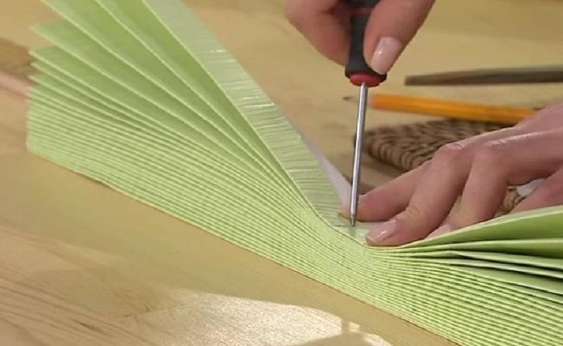 - Con un punzón afilado, haz un agujero en el centro del lienzo doblado. Ensarta el borde del hilo sintético, luego páselo por el orificio pasante del papel.