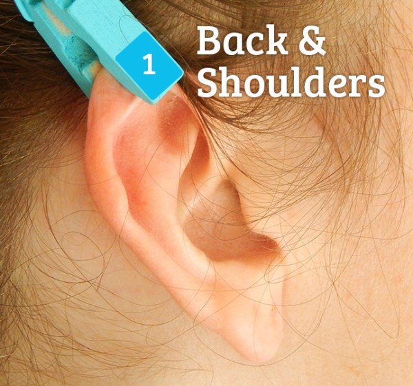 Las terminaciones nerviosas de estas partes del cuerpo se encuentran en la parte superior de la oreja. Para deshacerte de dolor en la espalda o los hombros, aprieta este punto con la pinza. Después de unos 60 segundos, sentirás que el cuerpo comienza a relajarse, y que el dolor poco a poco se va desapareciendo.